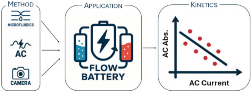 L’équipe de Stéphane Chevalier de l'Institut de mécanique et d'ingénierie (I2M, Arts et Métiers/Bordeaux INP/CNRS/Univ. de Bordeaux), en collaboration avec l'Université de Tokyo, a adapté une technique d'imagerie spectroélectrochimique pour cartographier les variations de concentration et les constantes cinétiques du couple MV / 4-HO-TEMPO. Initialement développée en terres girondines, cette méthode déploie, dans une puce microfluidique transparente, deux électrodes de platine espacées d’un petit millimètre. Un microscope équipé d'une caméra capture la lumière traversant les fluides tandis que les chercheurs modulent la tension appliquée à basse fréquence, créant une oscillation dans la concentration des réactifs. En filmant ces modulations et en les corrélant aux mesures électriques, les chercheurs déduisent le rendement énergétique et les cinétiques énergétiques des fluides.