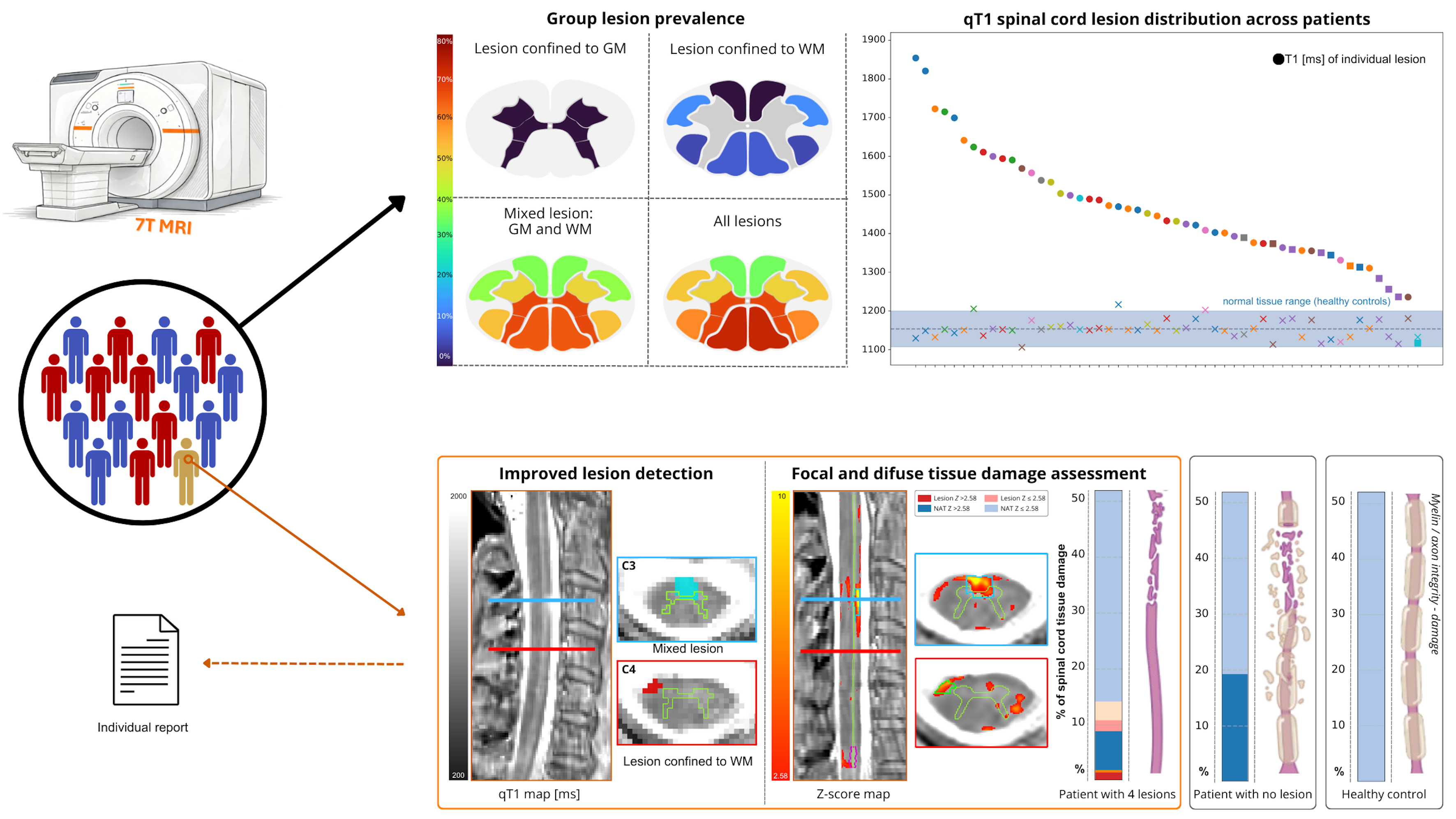 Dans cette étude exploratoire, menée chez 15 patients présentant une sclérose en plaques récurrente-rémittente et 15 témoins sains appariés selon l’âge, réalisée en partenariat avec le service de Neurologie - Maladies Inflammatoires du Cerveau et de la Moelle Epinière (MICeME, Hôpital de la Timone, APHM), la topographie et la distribution des lésions ont été analysées à l’échelle du groupe, montrant : une hétérogénéité des lésions, une atteinte préférentielle de l’hémi-moelle postérieure, ainsi qu’une prédominance de lésions mixtes (80%), touchant à la fois la substance grise et la substance blanche, tandis que 20% des lésions étaient confinées à la substance blanche. Un gradient d’altération a également été observé entre lésions, tissus d’apparence normale et tissus sains, traduisant une atteinte microstructurale diffuse, dans différents faisceaux de la substance blanche mais également dans les sous régions de la substance grise. Une analyse globale à l’échelle de l’individu, qui pourrait être utilisée en routine par les cliniciens pour le suivi et l’évolution pronostique, a également été proposée pour évaluer rapidement l’intégrité tissulaire de la moelle. Des atteintes structurelles infracliniques au stade précoce de la maladie ont ainsi pu être montrées. Enfin, aucune lésion localisée purement dans la substance grise n’a actuellement pu être détectée dans cette cohorte exploratoire. Cette étude devra être poursuivie avec l’inclusion d’un plus grand nombre de patients pour comprendre si ces lésions influencent le profil d’évolution des patients.