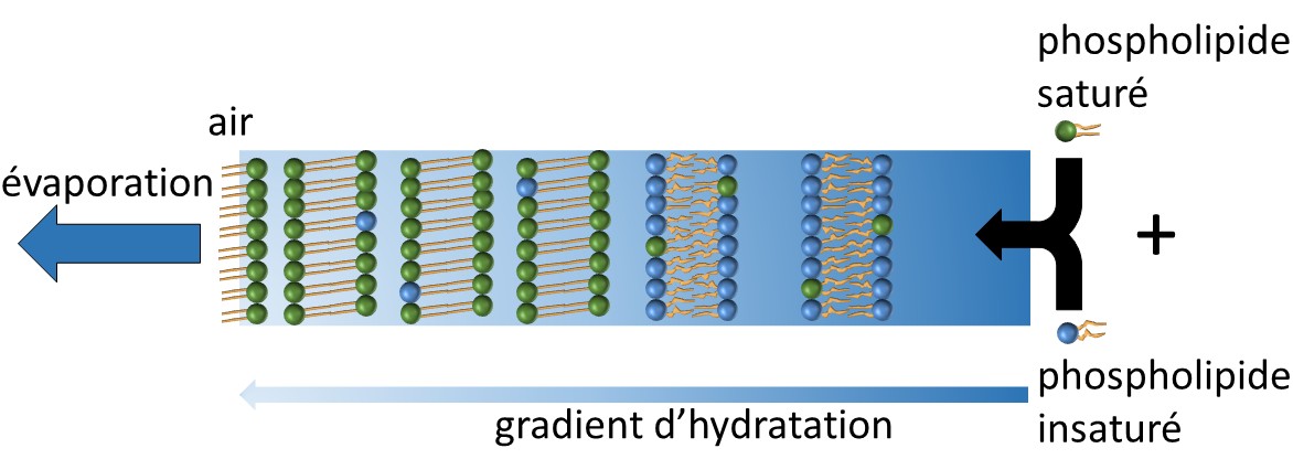Lorsque l’on place une dispersion de vésicules mixtes de phospholipides saturés (DPPC) et insaturés (DOPC) dans un gradient d’hydratation formé par évaporation de l’eau du mélange, les phospholipides ségrèguent spontanément le long de ce gradient.