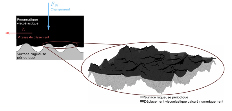 Pour résoudre ce problème, le Laboratoire de mécanique des contacts et des structures (LaMCoS, CNRS/Insa Lyon), en collaboration avec Michelin, a développé une méthode de calcul rapide pour modéliser ces phénomènes. La simulation numérique ne traite qu'une portion de chaussée et de pneumatique, en faisant l'hypothèse que le contact entre les deux se répète de manière périodique. Par ailleurs, les chercheurs ont élaboré un modèle semi-analytique, qui intègre des lois de comportement du matériau.