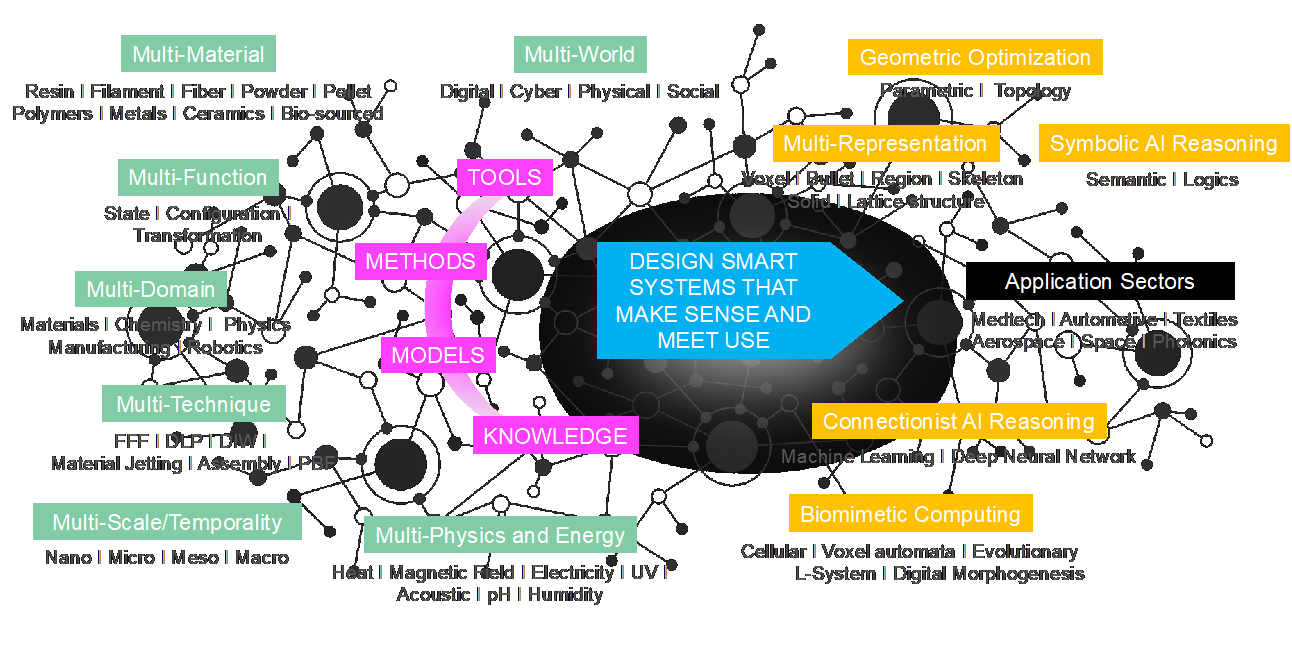L’impression 4D nécessite une convergence de multiples domaines de recherche issus de diverses disciplines telles que la physique, les sciences de l’ingénieur, la science des matériaux, la mécanique, la chimie, le génie des procédés, la biologie, etc. sans oublier les sciences de l’Homme et de la société. Elle doit prendre en compte les interactions potentielles entre les solutions technologiques émergentes et le corps social avec les tendances lourdes à prendre en considération (développement durable, écoconception, épuisement des réserves, Safe by design, innovation responsable/frugale, etc.). Le GDR TRANS4M a ainsi pour mission première de repousser les frontières des technologies d’impression 4D et d’exploiter leur potentiel transformateur pour applications pratiques acceptables et acceptées qui façonnent l’avenir. Pour ce faire, il s’agit de développer des approches prospectives et innovantes de l’impression 4D en capitalisant sur les principes issus des différentes sciences impliquées. En favorisant la coopération interdisciplinaire et le partage des connaissances, le GDR TRANS4M vise à pousser les limites de ce qui est aujourd’hui possible en termes de conception de matériaux, de techniques de fabrication et de capacités fonctionnelles des produits/systèmes et d’environnement.